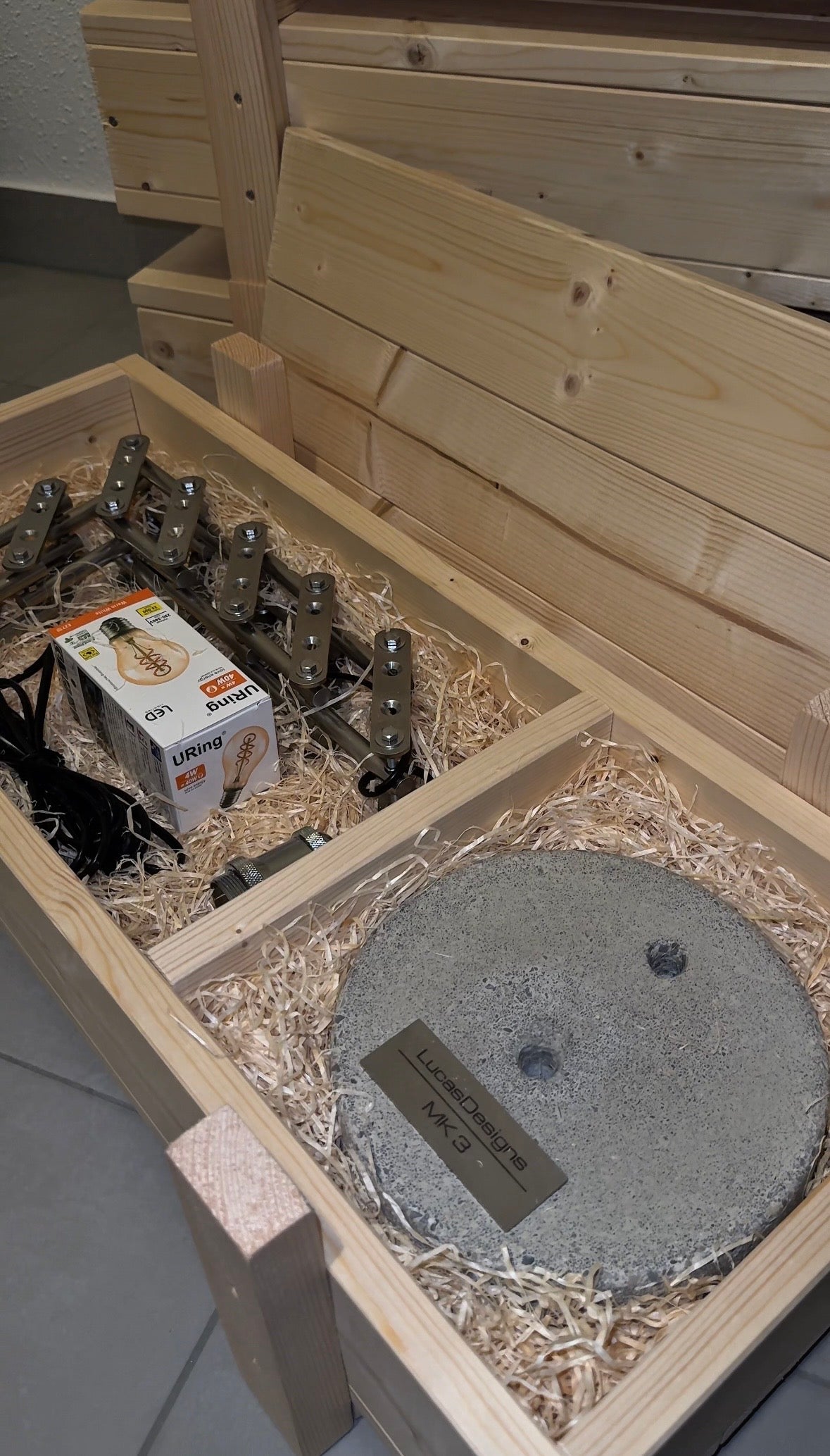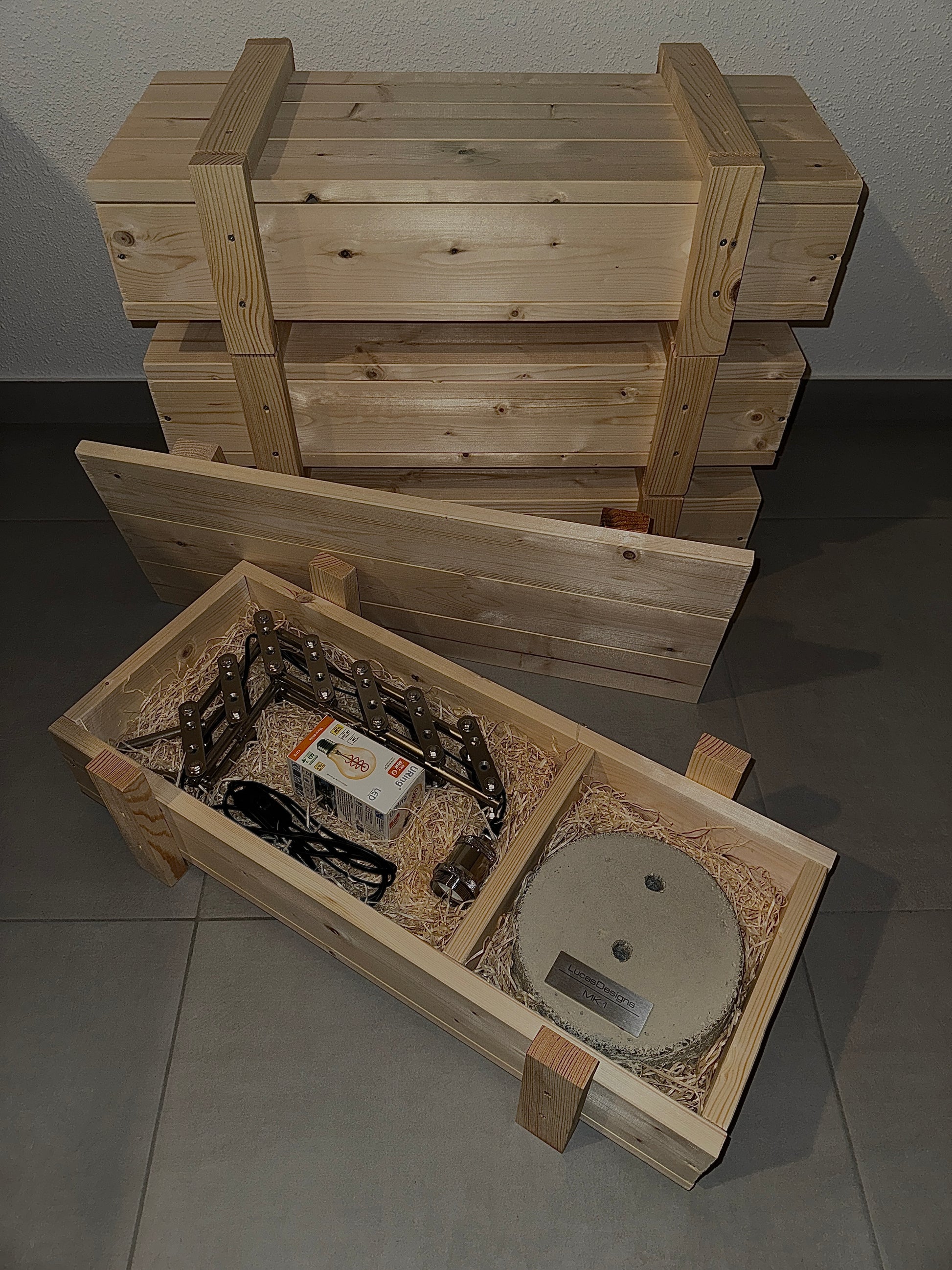 Geliefert wir die Designerlampe in einer handgefertigten Transportbox aus Massivholz, die von klassischen Wein- und Munitionskisten inspiriert ist.
