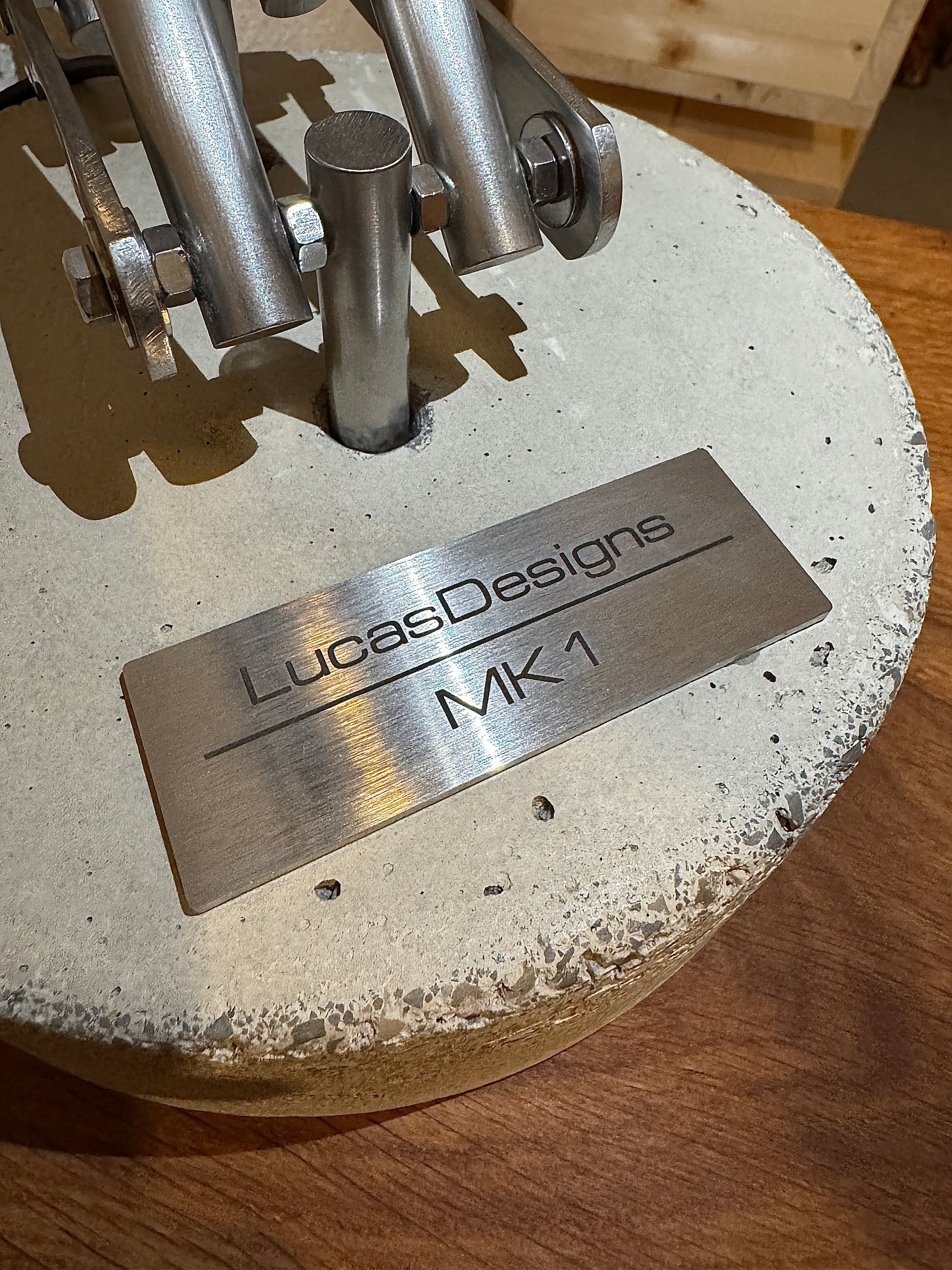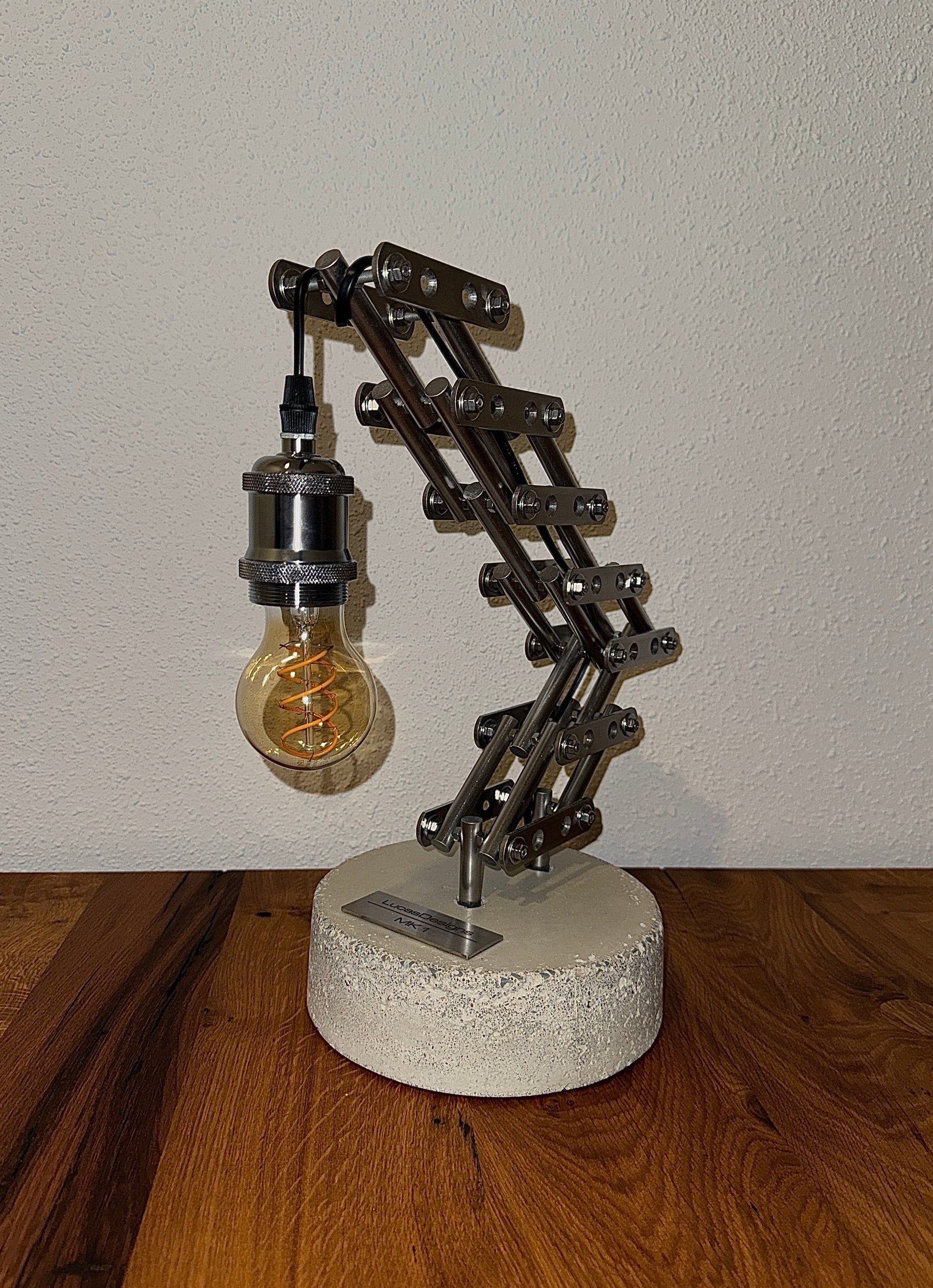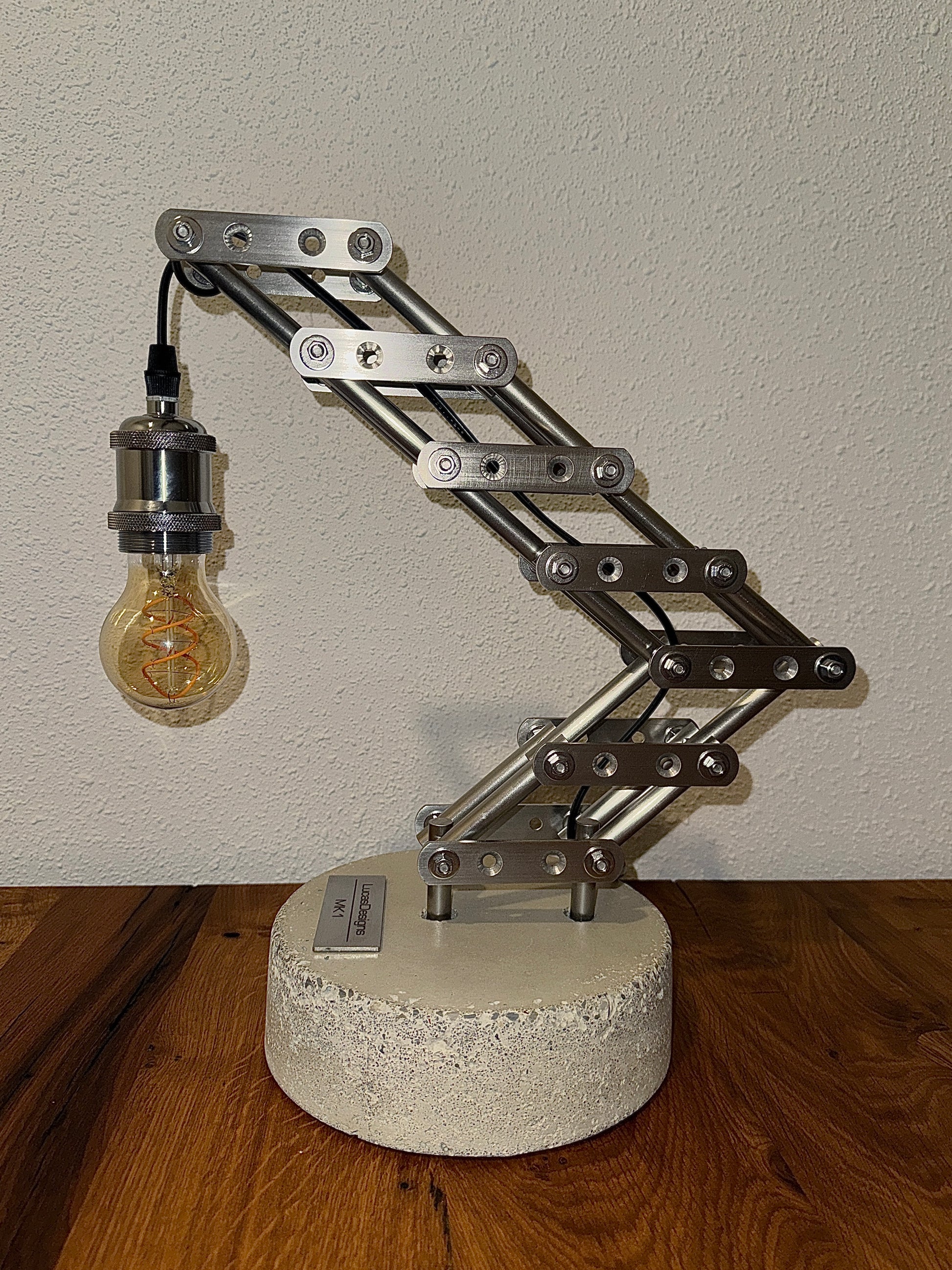 Das handgeschliffene Betonfundament verleiht jeder Lampe einen ganz persönlichen Charakter. Es wird mit einer handgebürsteten Edelstahl-Ablage ausgeliefert, die durch einen Alcantara-Bezug für einen stabilen Stand sorgt und den Untergrund vor Kratzern bewahrt. Das filigrane Gestell aus handgebürstetem Edelstahl erinnert an ein modernes Kranskelett und verleiht der Lampe einen Industriellen Charme. In Kombination mit dem warmweißen Leuchtmittel entsteht eine behagliche Atmosphäre.